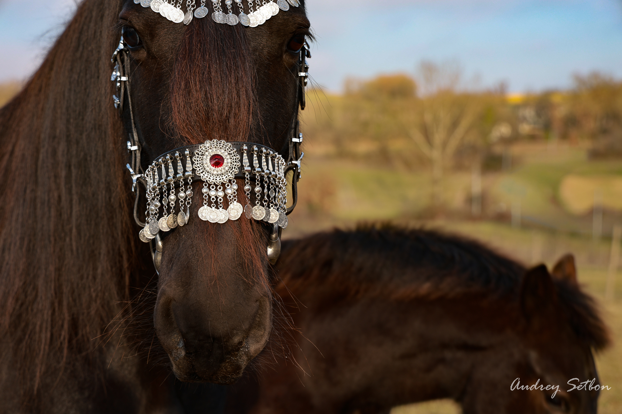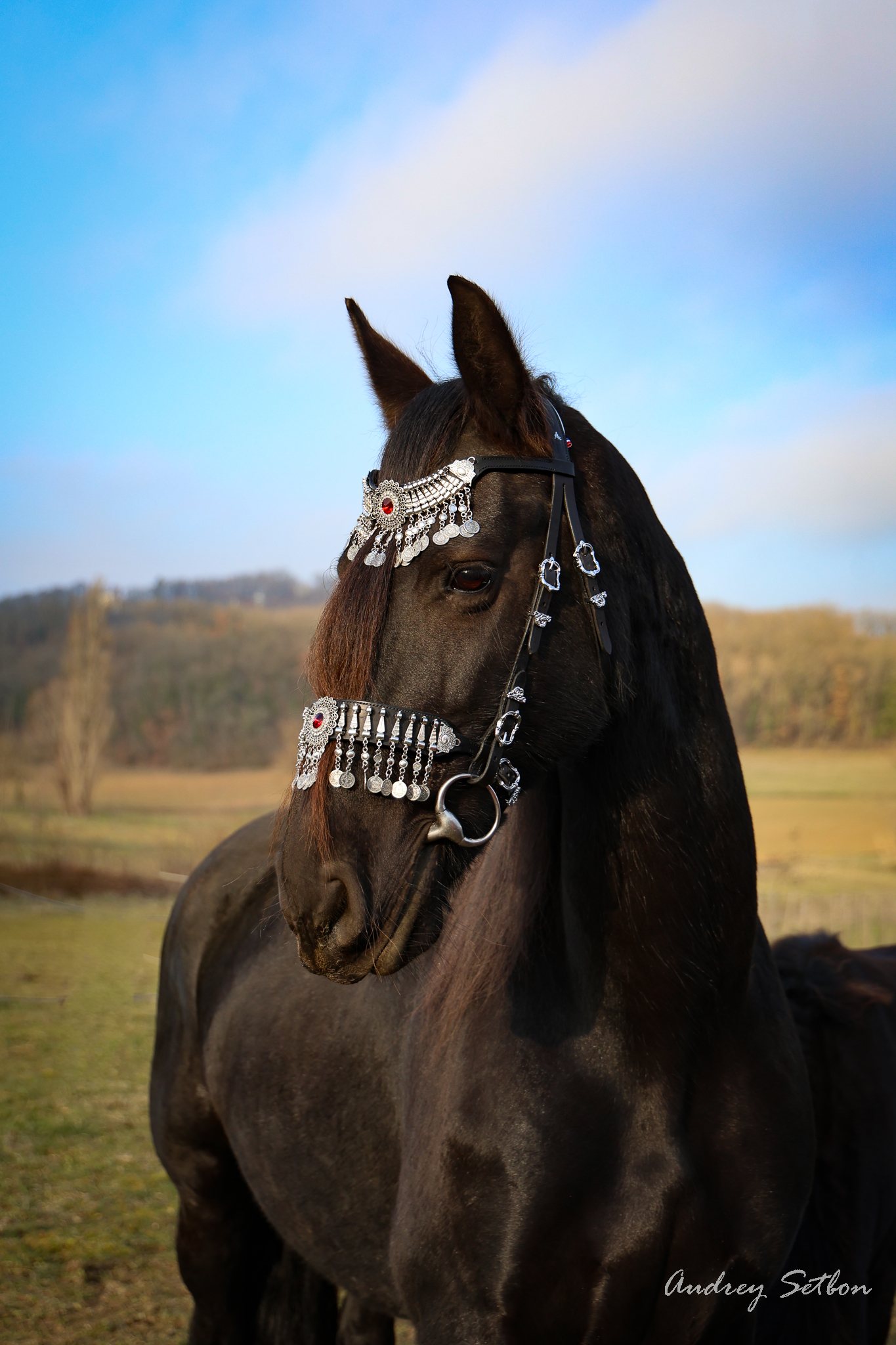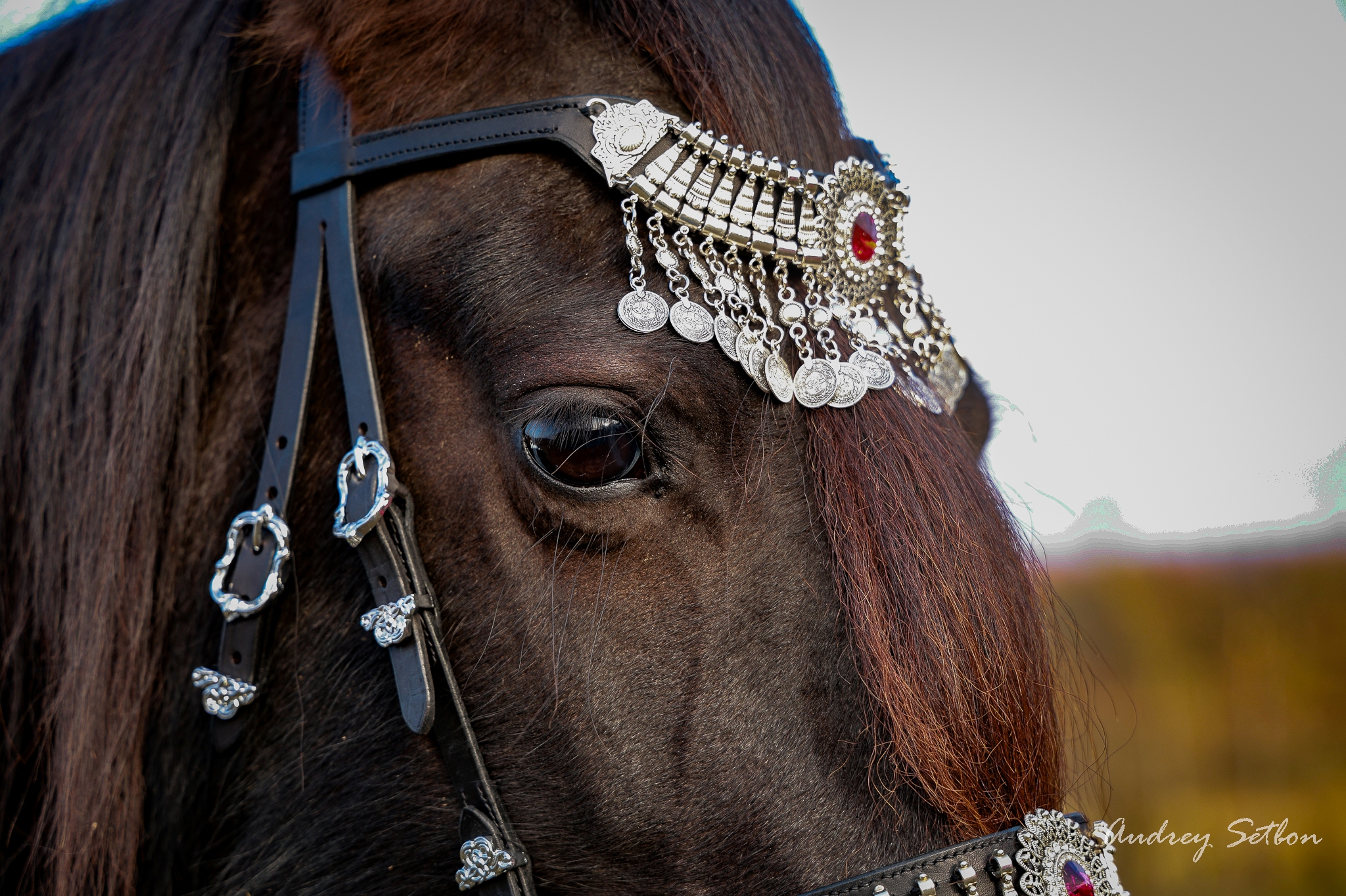 Décorations : pierre incrustée sur le frontal, ornements sur la muserolle